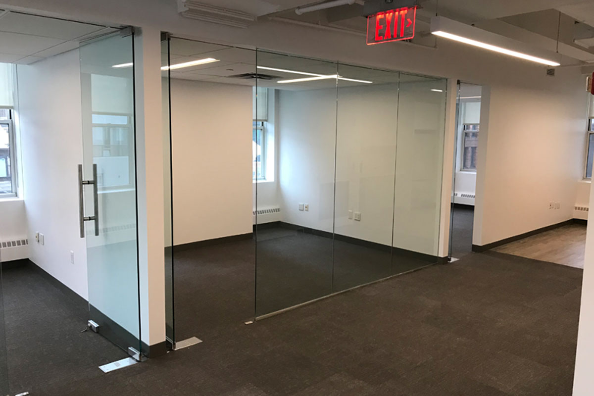 Interior Renovation of 3,500 square foot office space in downtown Manhattan. Work included demolition of walls and existing drop ceiling, followed by installation of new glass partitions and doors, sheetrock ceiling, light fixtures, as well as renovating the pantry area with new mill work, flooring, counter, appliances, and sink with associated plumbing connections. The project also included sprinkler and HVAC upgrades to existing systems. All work was done while protecting existing carpet.